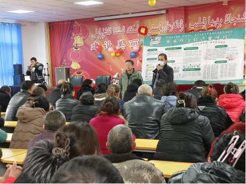 1月5日,一师·太阳成集团tyc151cc“乡村振兴”共兴工程科技特派员服务团队第五分队成员(胡建军、李静、阿力木·阿木提)、六团农业发展服务中心主任涂云锋、六团七连党委书记王道云等前往阿克苏市喀拉塔勒镇多斯库里村开展畜间牛羊布病、人间布病防治基础知识和牛羊疾病防治科技服务宣讲活动。