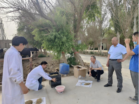在调研过程中,蒋涛教授带领研究生对十二团托峰冰川一牧场处于泌乳期的奶牛圈舍的全混合日粮进行了宾州筛,发现各圈舍全混合日粮处于标准水平。此外,牧场工作人员讲述了近期奶牛生产运营情况和存在问题,专家团针对牧场存在的问题进行现场考查,并结合现场调研情况,为牧场相关生产问题提出了切实可行的解决方案。